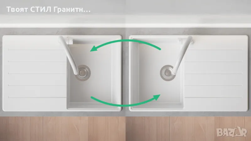 • Гъвкавост на дизайна - мивката е въртяща се - отцедникът може да се монтира отдясно или отляво