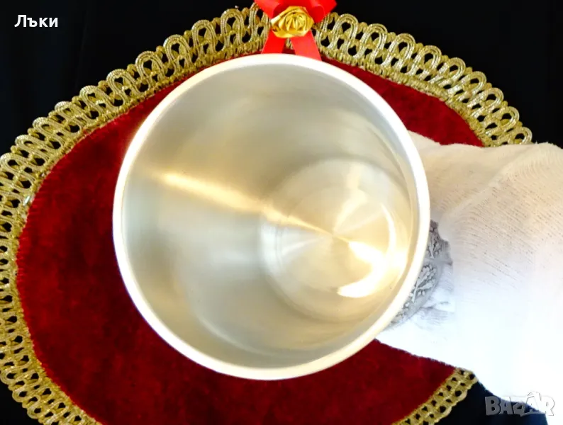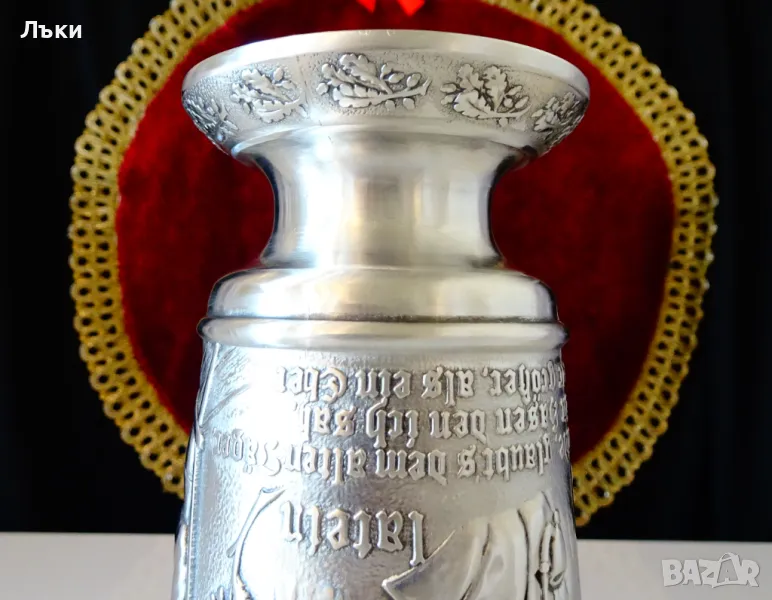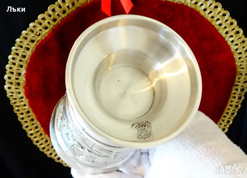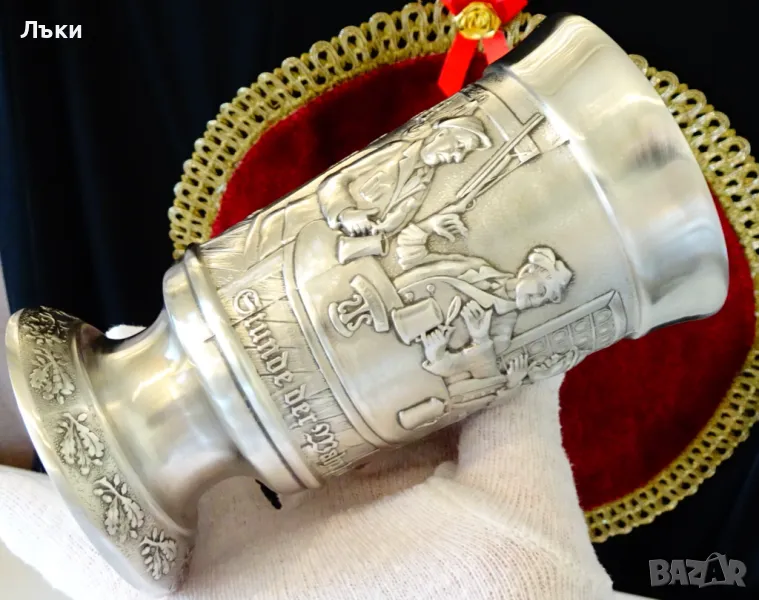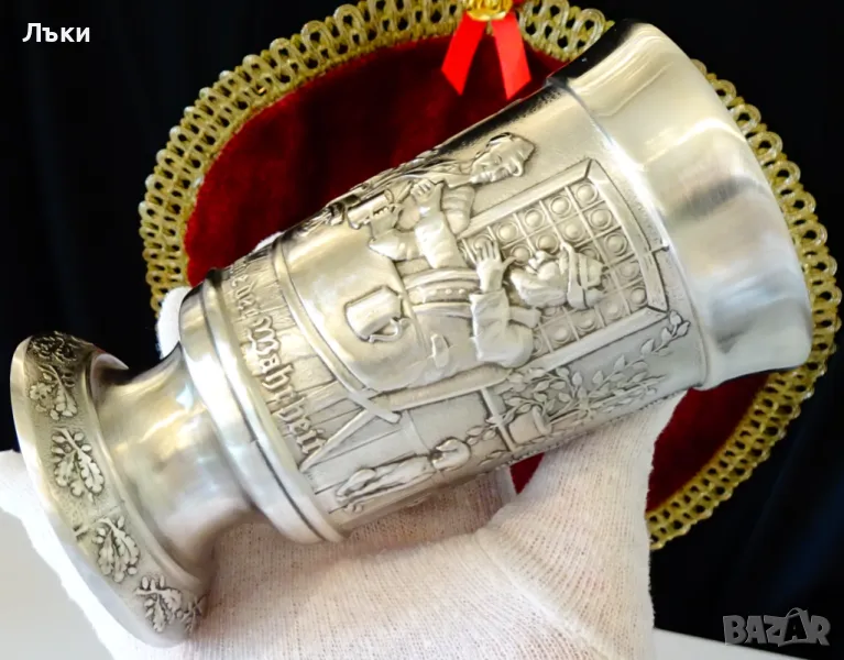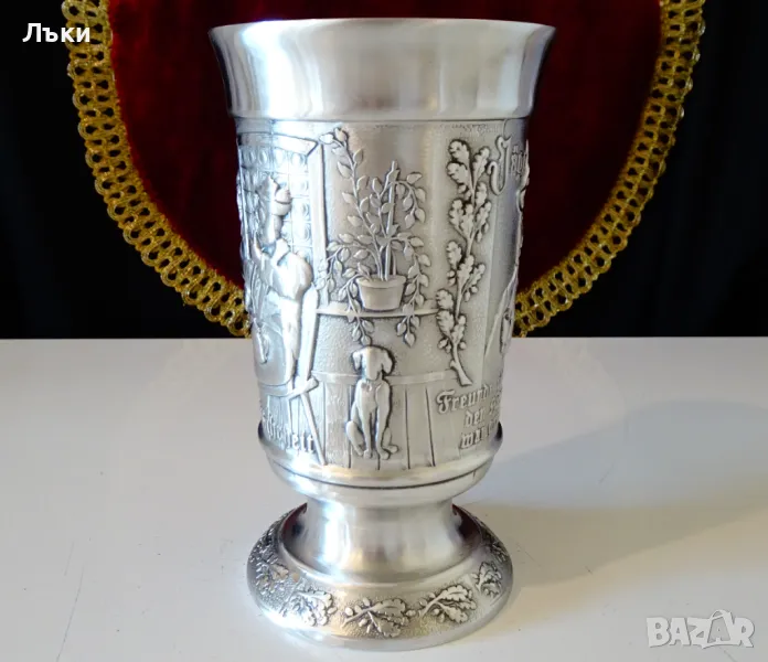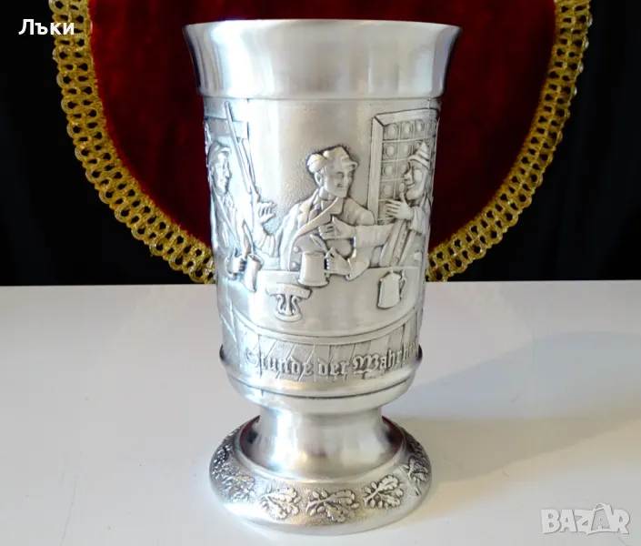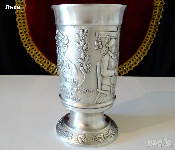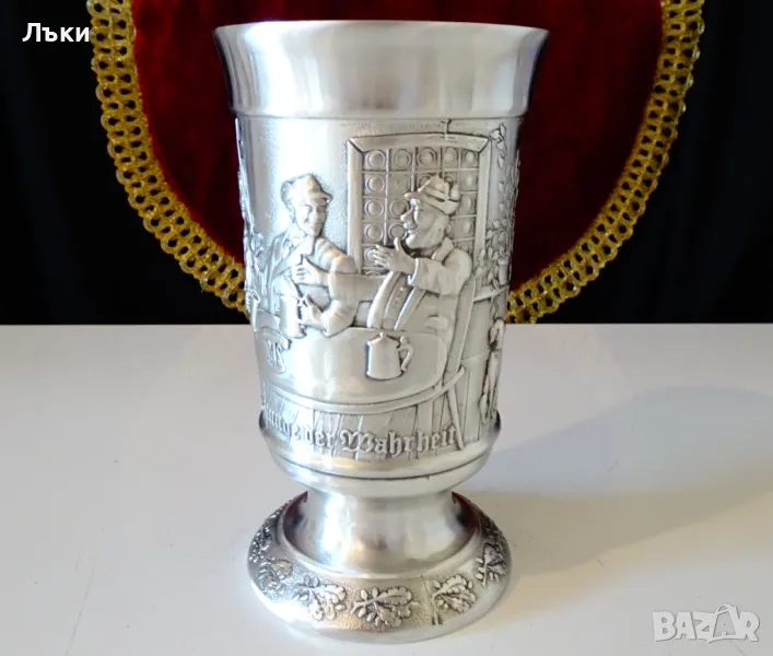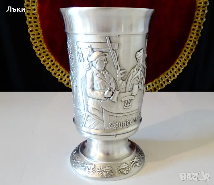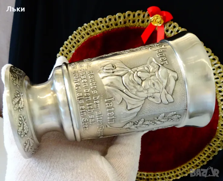 изработка от 95% калай и 5% сребро,маркиран със знак за високо качество.Посветен на лова и на ловците,този впечатляващ бокал е декориран с релефен портрет на Ловец,който пуши лула.Релефно изписан текст разкрива,че стария ловец вярва,че