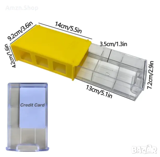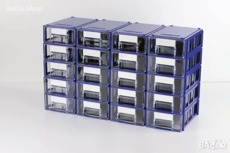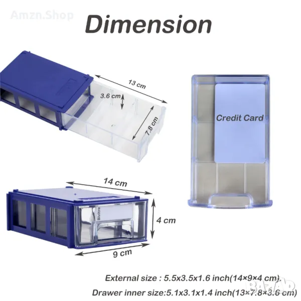 Външен размер на всяка кутия с малки пластмасови чекмеджета: 5,5x3,5x1,6 инча (14x9x4 см). Вътрешен размер на чекмеджето: 5.1x3.1x1.4 инча (13x7.8x3.6 cm).