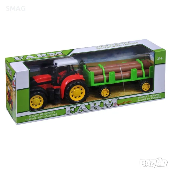 Играчка превозно средство, трактор с ляво и дясно въртящи се колела и ремарке.
