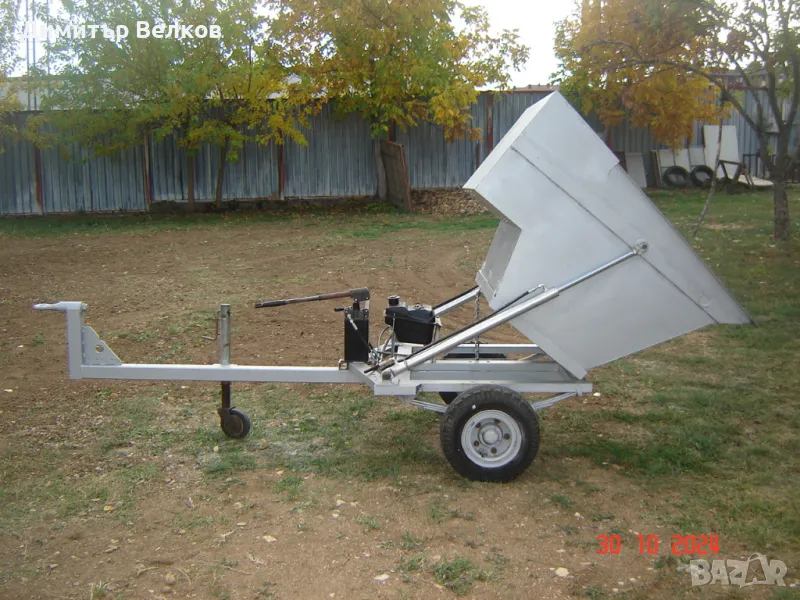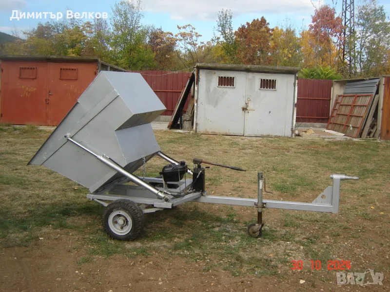 Продавам селскостопанско самосвално ремарке. Едноосно. Неръждаем кош, ръчна двойнодействаща хидравлична система /помпа и цилиндри/. Проектирано за превоз на торове, фуражи, грозде и др. Размери : - Дължина = 320 см. , Височина = 135 см. , Широчина= 135 см. Обем на коша = 0,7 куб.м. Товар макс.= 1 тон. Гуми - 6.00 х 9.00. Без спирачки и светлини.