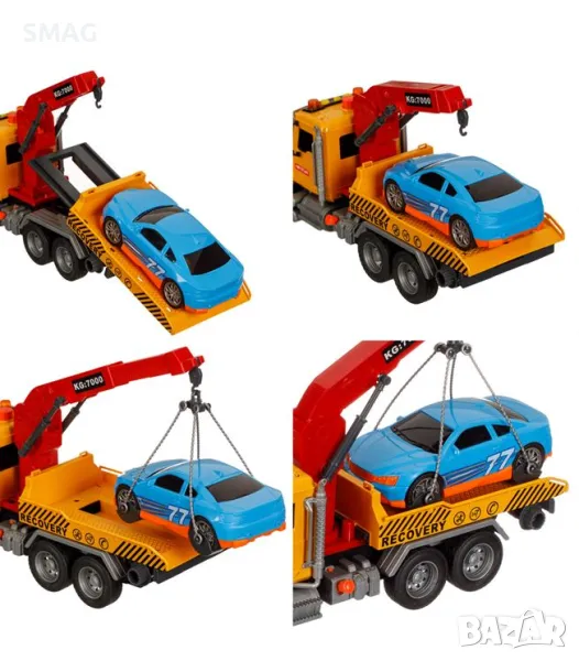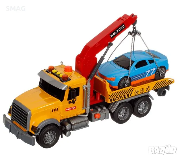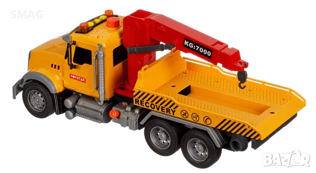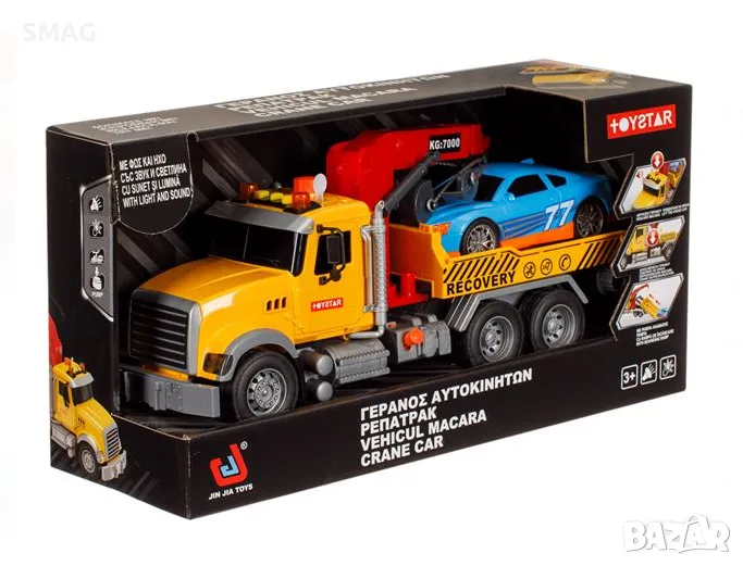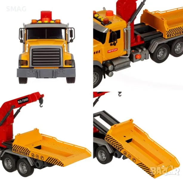 Играчка кран с рампа за катерене и превозно средство. Има възможност за повдигане и декомпресия на крана. Рампата се движи назад и надолу. Има светлини и реалистични работни звуци. Работи с 3 батерии тип AG3 (включени).