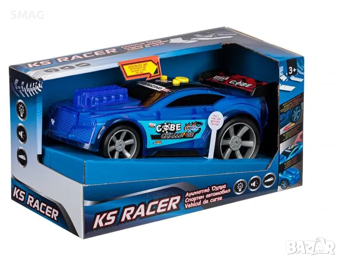 Играчка превозно средство състезателна кола в син цвят със сменящи се светлини, работни звуци и звукови ефекти и бутон, който движи превозното средство напред. Работи с 3 батерии АА (включени в комплекта).
