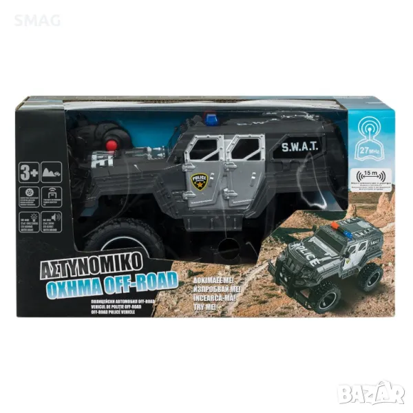 Играчка полицейски джип с дистанционно управление с издръжлив дизайн, напълно функционален, максимално разстояние от контролера 15 м, светлини и звуци. Работи с 5 AA батерии за автомобила (не са включени) и 2 AA батерии за контролера (не са включени).