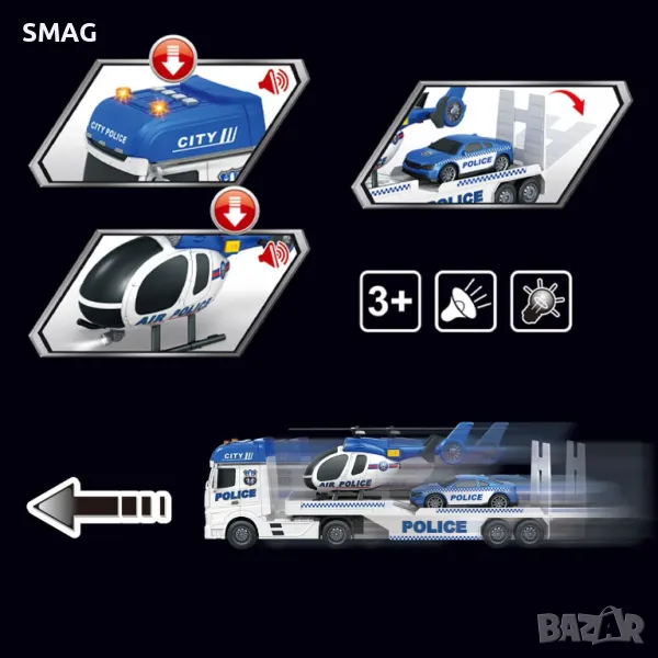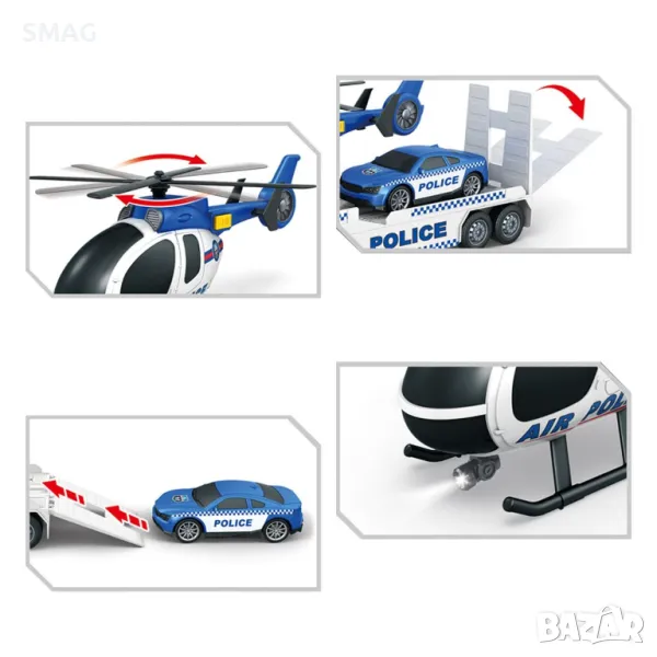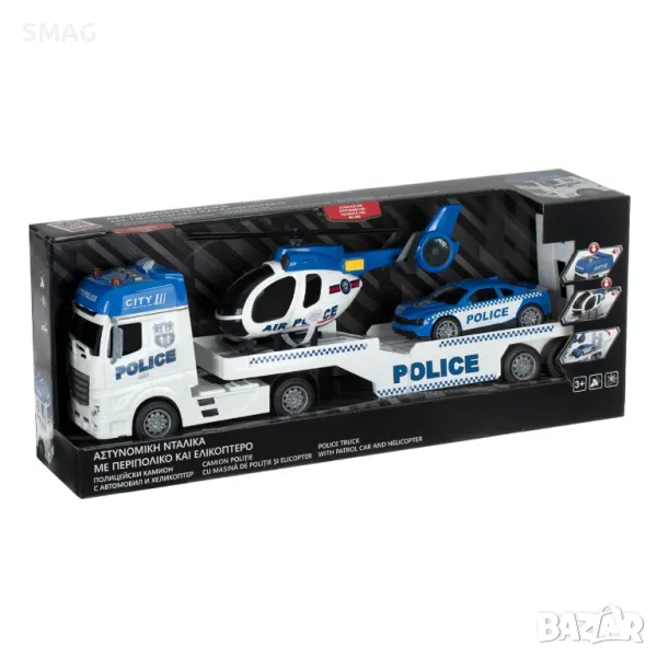 Полицейски камион с движещи се звуци и светлини с ремарке, което е натоварено с хеликоптер и патрулна кола. Рампата на ремаркето пада, за да разтоварят превозните средства. Хеликоптерът има звуци в режим на полет. Работи с 3 батерии LR44 за хеликоптера (не са включени) и 3 батерии LR44 за камиона (не са включени).