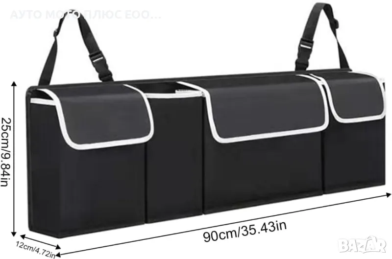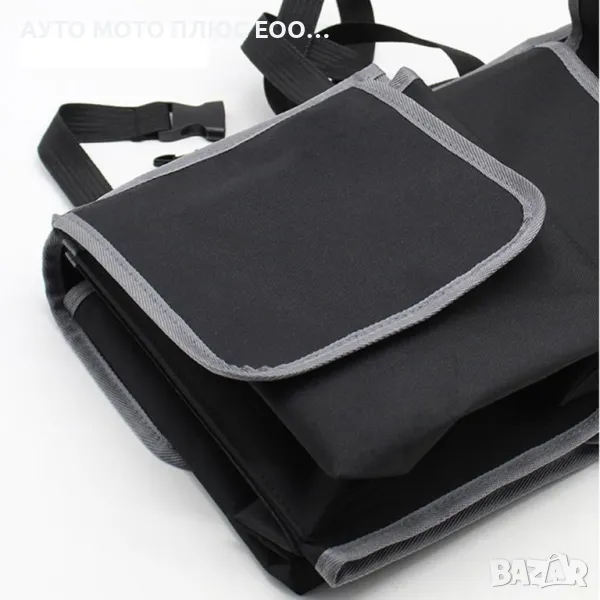Мултифункционален oрганайзер за багажник с 3 броя големи джоба, подходящ за съхранение на всякакъв багаж. Поставянето на органайзера в колата е лесно – чрез велкро ленти се захваща към гърба на задната седалка, а за по-голяма стабилност се захваща за подглавниците чрез регулируеми колан - презрамките и катарамите се регулират и фиксират много лесно. Когато не го използвате, може да го сгънете.