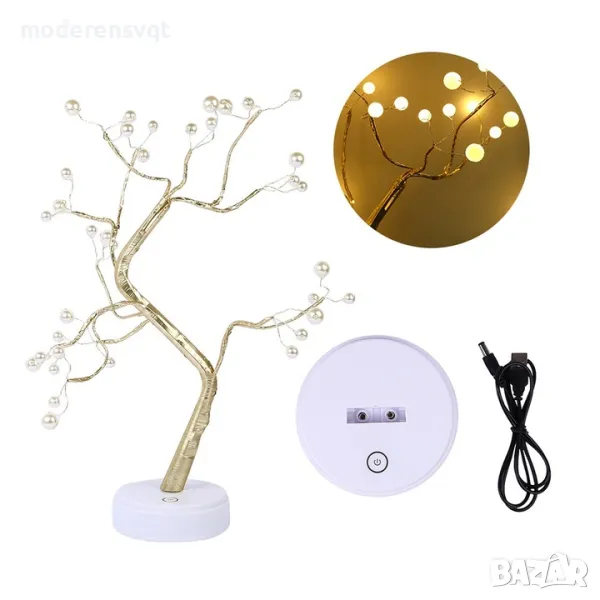 Коледно дърво с топли бели LED светлини, перла елегантен външен вид, идеални за декорация на дома на бюрото или LED лампи за маса. Перлени клонови светлини и кръгла основа. Просто докоснете, за да включите осветлението.