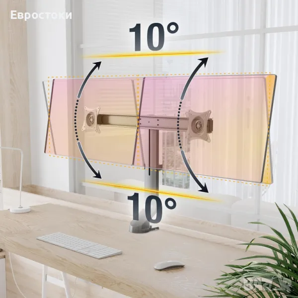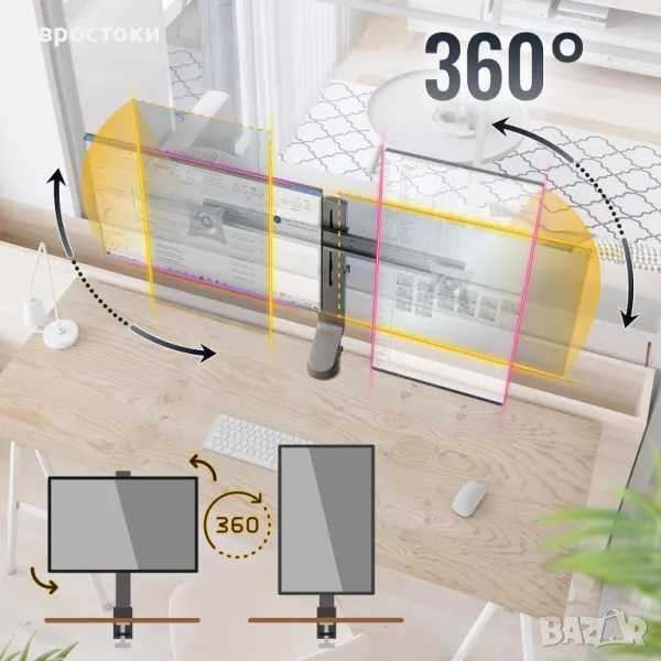 Монтаж на ръба на масата, регулируема височина, завъртане на монитора на 360°, въртяща се плоча +/-10°, възможен наклон +/-10°