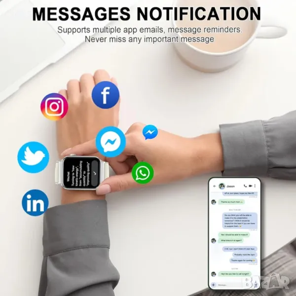 Осъществяване/отговаряне на обаждания и четене на съобщения: Смарт часовникът T50S е оборудван с вграден HD високоговорител, след като се свържете с вашия смартфон чрез Bluetooth, можете директно да използвате смарт часовника, за да отговаряте или да извършвате повиквания. И поддържа множество интелигентни напомняния, включително текст, SNS съобщения (Facebook, WhatsApp, Instagram, Twitter и т.н.), ежедневно напомняне и т.н. Всички известия се показват на смарт часовниците ви и се напомнят чрез вибрация, така че никога да не пропуснете важна информация .