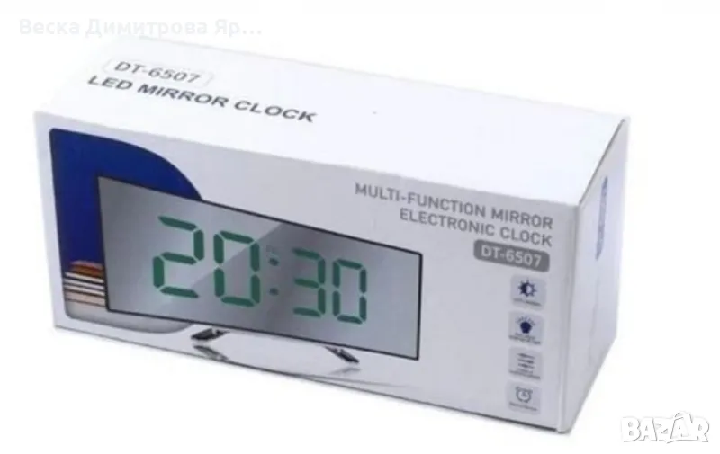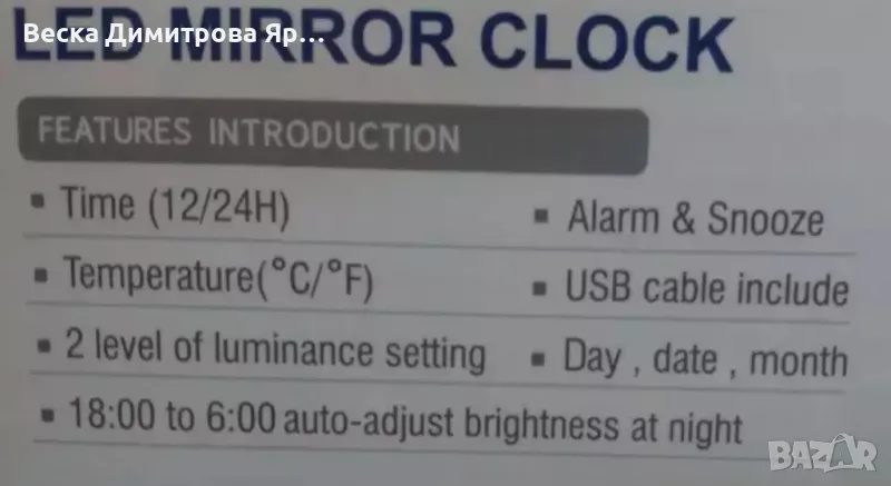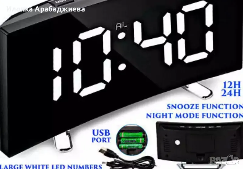 Показва време в 12/24 часов формат;Изобразяване на ден, месец, година;Показване на температура в градуси Целзий/Фаренхайт;Функция аларма с дрямка;Две нива на осветеност на дисплея;Автоматична настройка на яркостта от 18:00 ч. до 6:00 ч.;Захранване чрез USB кабел (включен в комплекта);Размери на устройството: 17 х 7.5 см;Размер на цифрите: 4,3 х 1 см;Гаранция: 12 месеца.