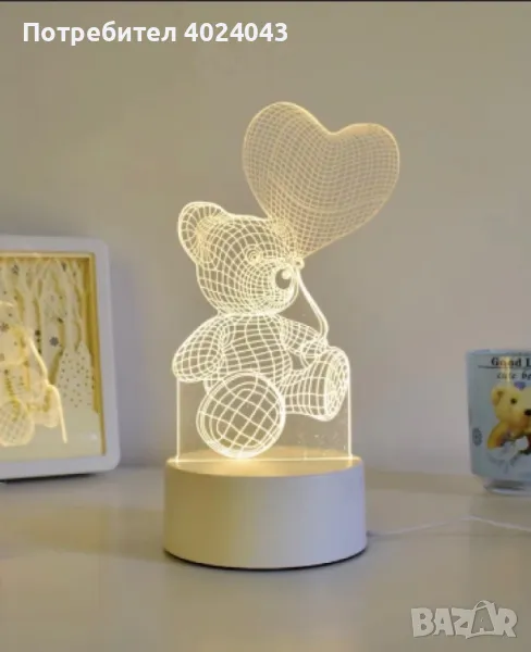 Ново вдъхновение от новата технология! Купете оригинални подаръци за Вашите близки и приятели или направете един страхотен подарък на самите себе си. Снабдете се с уникалната 3D LED нощна лампа, която има холограмен ефект.Вариант 1: Медуза;Вариант 2: Айфеловата кула;Вариант 3: Коледна елха;Вариант 4: Мече със сърце;;Вариант 5: Елен;Вариант 6: Еднорог;Вариант 7: Многобройни сърца;Вариант 8: Мече със сърце балон;