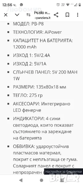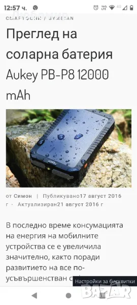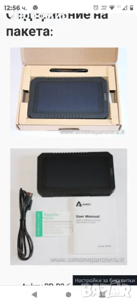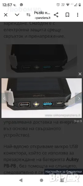 USB-micro USB кабел за зареждане на батерията, но може да се използва и за зареждане на устройства с micro USB конектор.Преносимата батерия Aukey PB-P8 автоматично разпознава свързаните устройства и винаги доставя максималния ток, необходим за бързо и безопасно зареждане. Снабден е с електронна защита срещу свръхток и пренапрежение.долната част на преносимата батерия има два USB порта , като се започне отляво, първият доставя 1 A ток, вторият 2 A, с технология AiPower (електронно управлявана доставка на енергия въз основа на свързаното устройство).