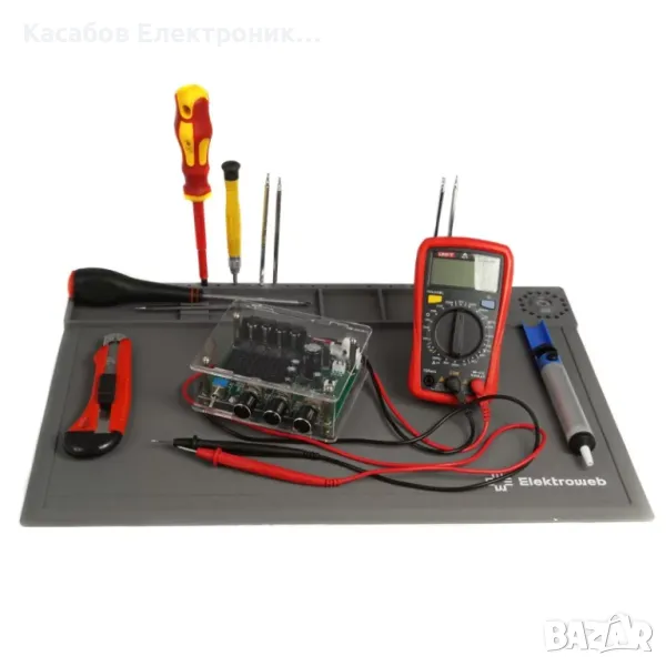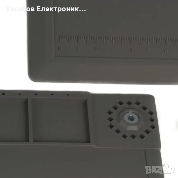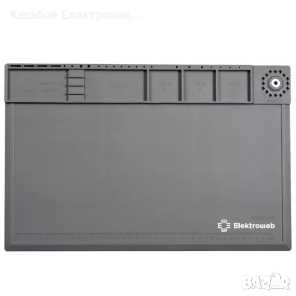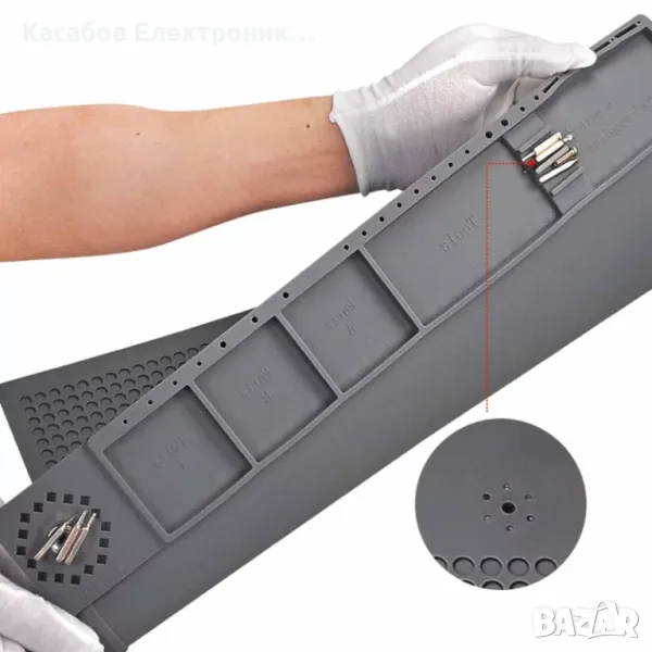 Голяма сива сервизна подложка, полезна при запояване или обслужване на електронни устройства. Има номериран органайзер за винтове и гайки. Магнитните полета ви позволяват удобно да откачите винтовете, докато ги развивате и улесняват работата. На долния ръб на постелката е отбелязана линийка.