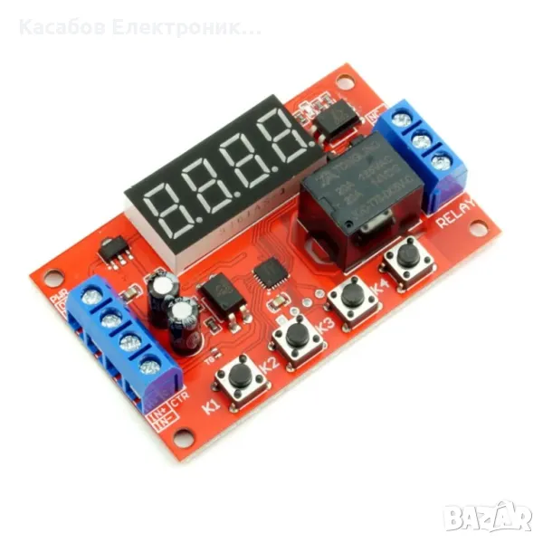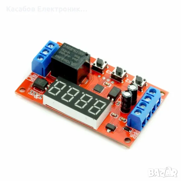 Релеен модул с таймер за универсална употреба, с 32 режима на работа. Модулът се захранва с 12V DC, има 0.36" дисплей и бутони за промяна на настройките. Изходът е реле, което поддържа 14VDC и 20A постоянен ток и 125VAC и 20A променлив ток. На платката има запоени винтови клеми, което позволява удобен монтаж на кабели. Модулът поддържа времеви настройки от 0,01 секунди до 999 минути.