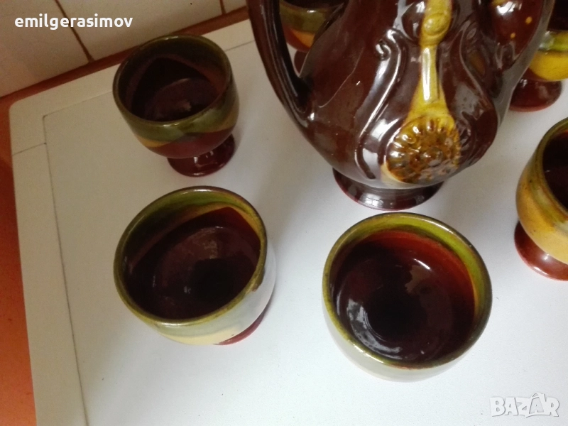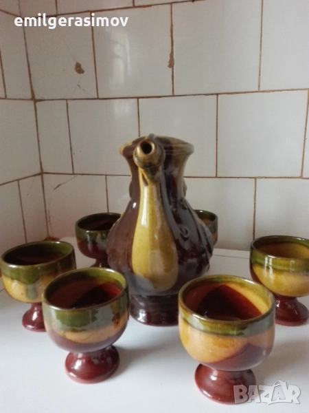 2. Български сервиз за вино - глазирана керамика , пълен комплект.Кана с вместимост 1,3 кг и шест чаши с вместимост по 180 мл.л. Много добро