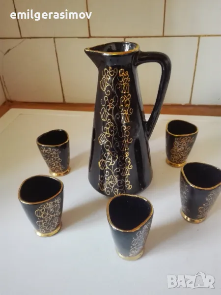1,Красив порцеланов сервиз за ракия с позлата. Отлично състояние. Пълен комплект - каничка и шест чашки. Маркиран. Цена 12.50 евро.