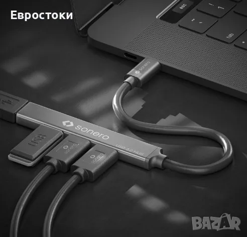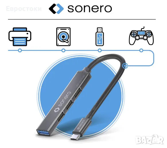 Sonero S-UH110-001 USB хъб, 4 порта, 1x USB 3.2 с 5 GB/s, 3X USB 2.0 с 480 MB/s, USB-C щепсел