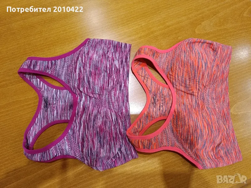1.Дамска блуза с презрамки IKKS, ширина под мишниците 39 см, дължина 60 см2. Два броя спортни сутиени/бюстиета. Изпрани, не са носени. Отговарят на размер С3. Къса