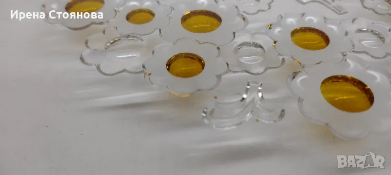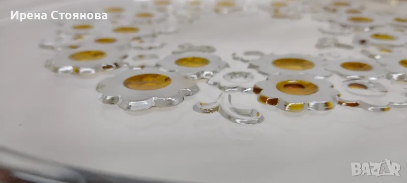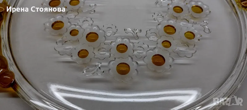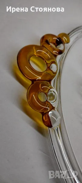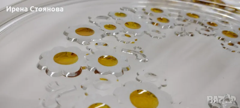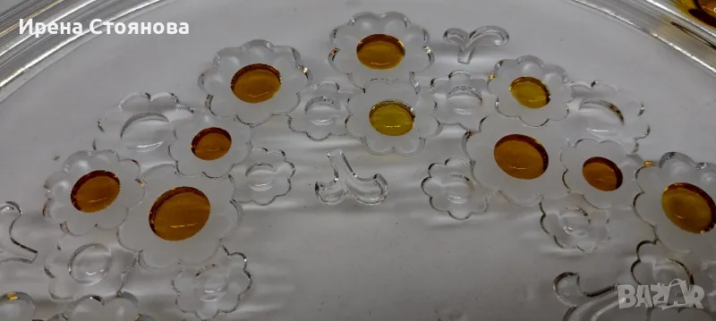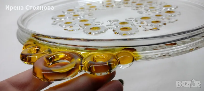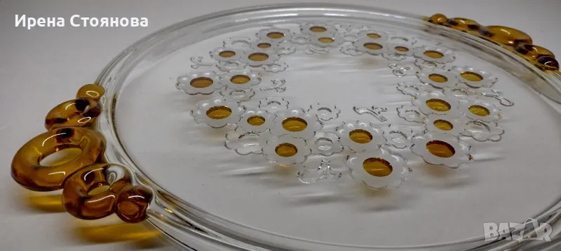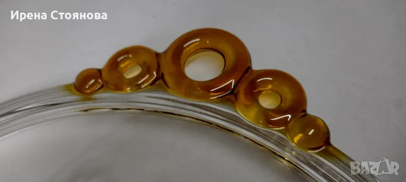 Красива, елегантна с тъмно жълти до кехлибарени цветове, Диаметър 30 см, с дръжки 37 см, височина 2,5 см. В много добро състояние, на места минимални, следи от употреба, две по забележими драскотини. Цена 55 лв.