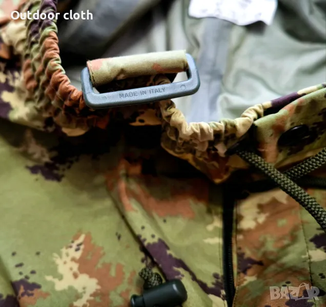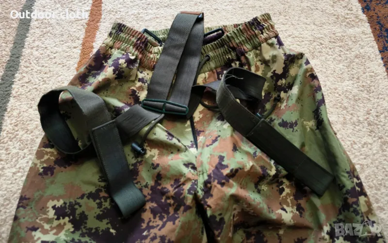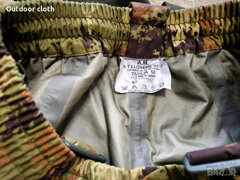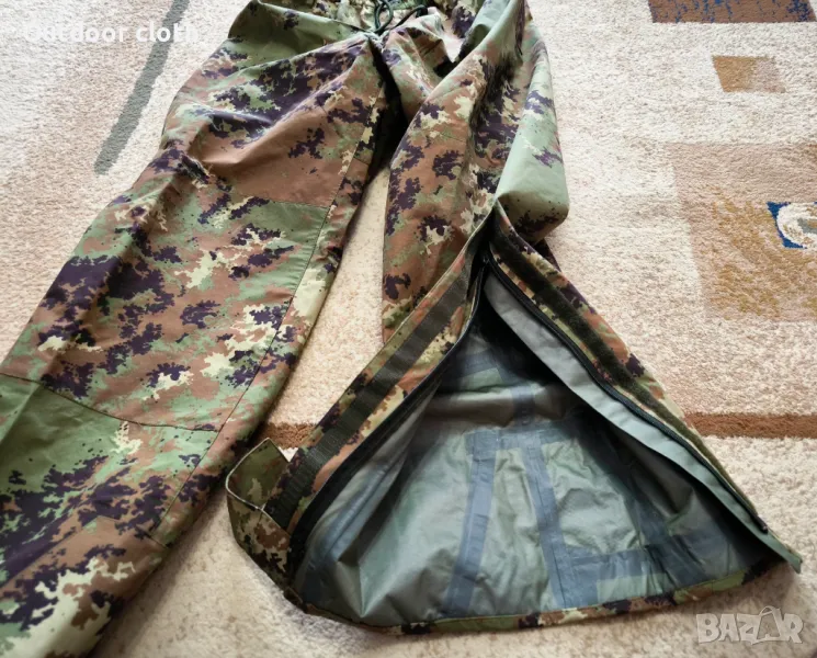 Непромокаем дишащ панталон на италианската армия. Доста сериозен панталон,трислоен, мембраната най-вероятно е Gore-tex,направен от много здрава материя.Предвиден е да се носи върху друг панталон,долни ципове за лесно обуване и събуване,удобни широки