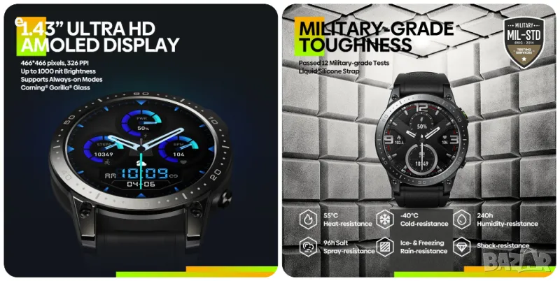 -Задвижван от усъвършенстван чип Realtek 8763EW, Ares 3 Pro предлага плавна работа и бърза реакция на вашите команди. Оборудван с 1,43-инчов Ultra HD AMOLED дисплей с разделителна способност 466 x 466 пиксела и яркост до 1000 нита, той винаги осигурява ясен достъп до информация, дори и в най-слънчевите дни. Освен това Ares 3 Pro предлага богат избор от циферблати, което ви позволява да променяте външния вид на своя смарт часовник всеки ден.