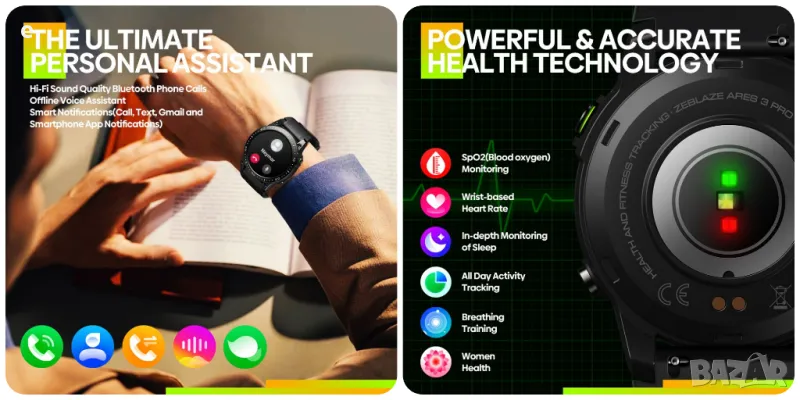 -С възможността да провеждате разговори от китката си и да получавате push известия, Zeblaze Ares 3 Pro гарантира, че никога няма да пропуснете важно съобщение или обаждане. Той също така поддържа офлайн гласов асистент, което улеснява управлението на функциите на часовника, без да посягате към телефона си.
