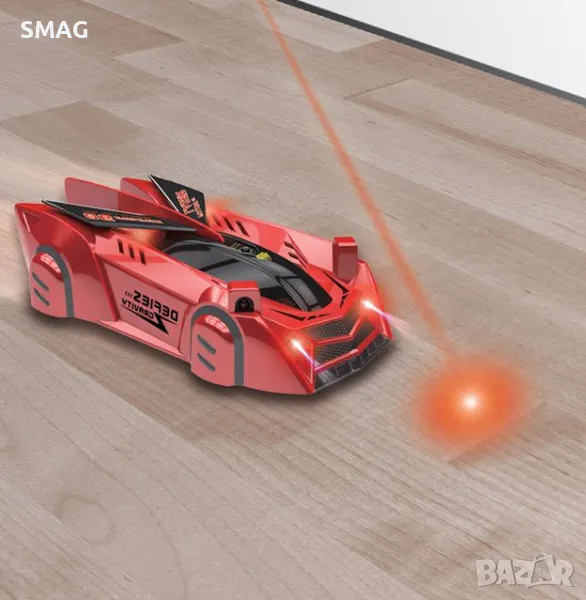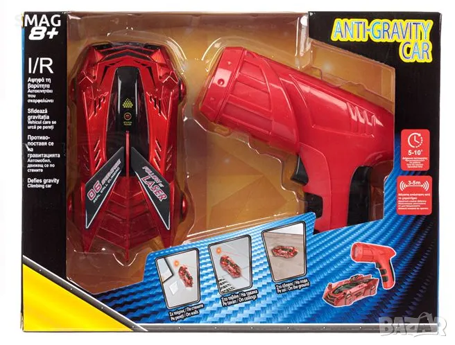 RC кола в цвят червен металик, която се противопоставя на гравитацията и се катери по стената, тавана или се движи по земята. Лесно се контролира и задвижва от контролера и преследва лазерен лъч (не е истински лазер, а червен светодиоден лъч, който не е вреден за човешкото тяло или очи). Зарежда се с USB кабел. Работи с 1 батерия тип 3,7 V за автомобила (включена) и 3 батерии тип AAA за контролера (не са включени).