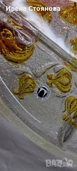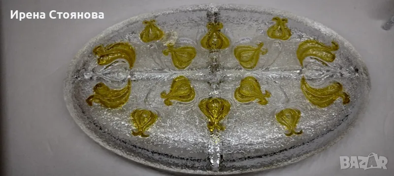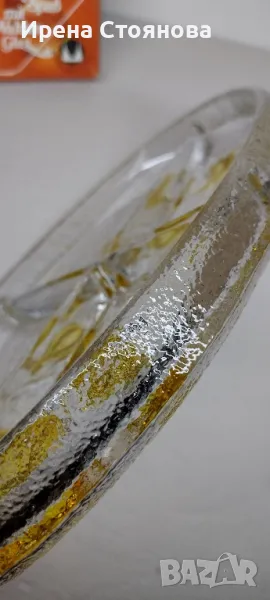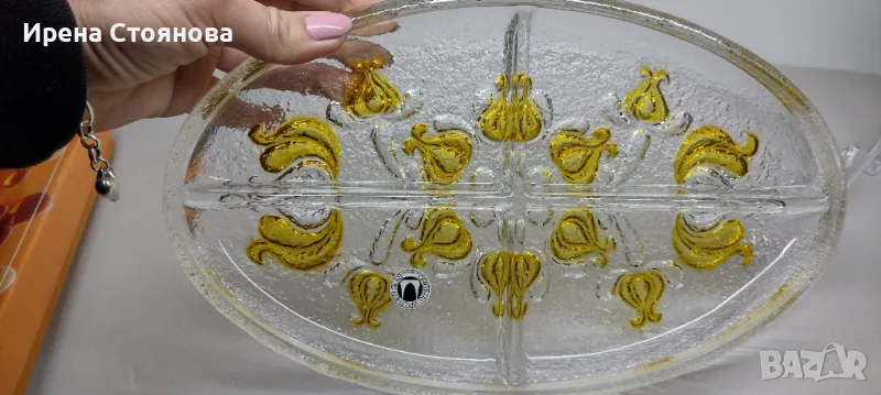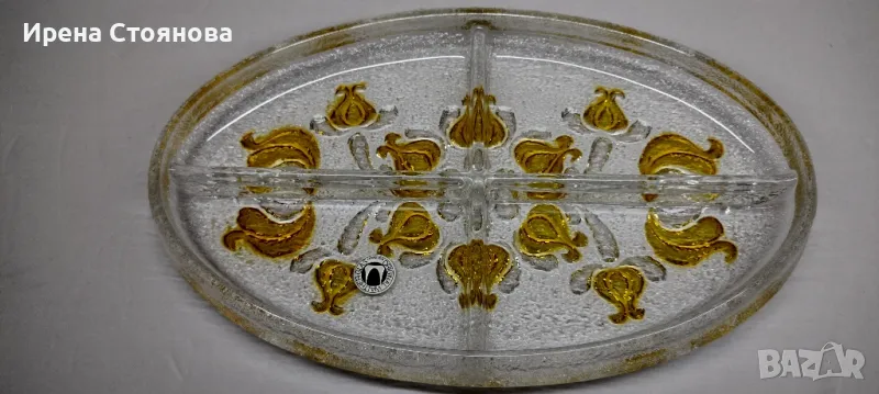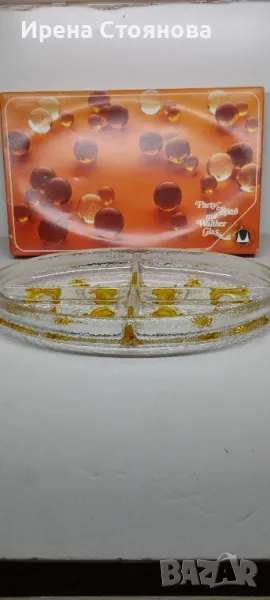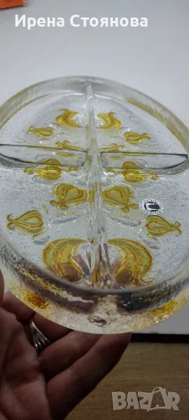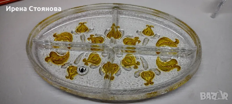Парти чиния с четири разделения Walther Glas. Плътно, масивно пресовано кристално стъкло , релефни цветя в различни кехлибарени тонове. Много красива игра на цветове и красиви оптични ефекти - особено при подходящо осветление.