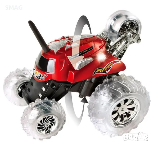 RC превозно средство с контролер. Върти се на 360º, стои на колело и има светлини. Работи с 4 AA батерии за контролера (не са включени) и 1 9V батерия за автомобила (не e включенa).