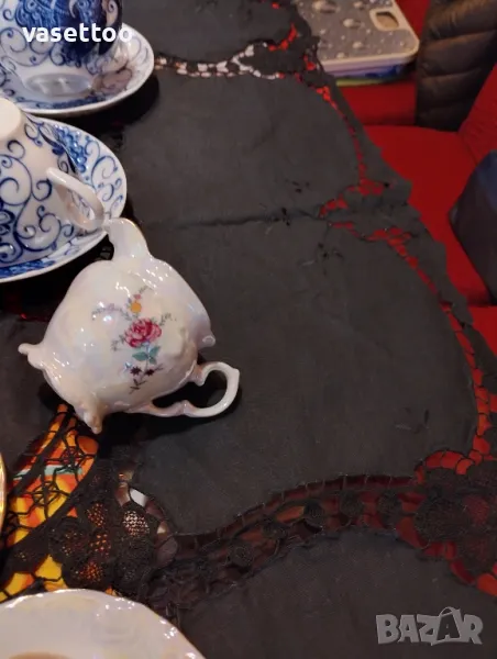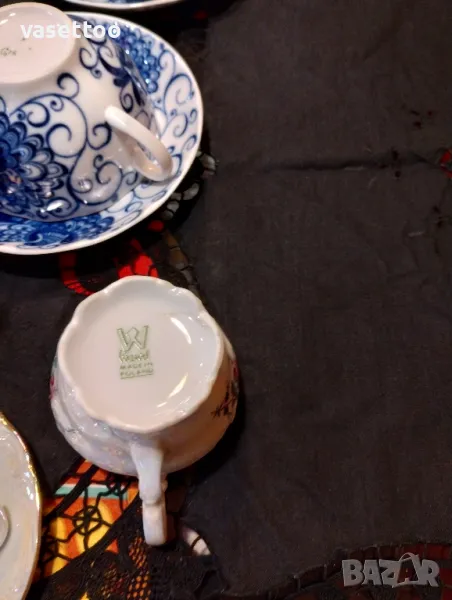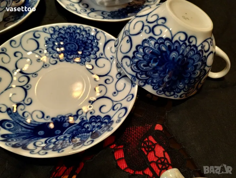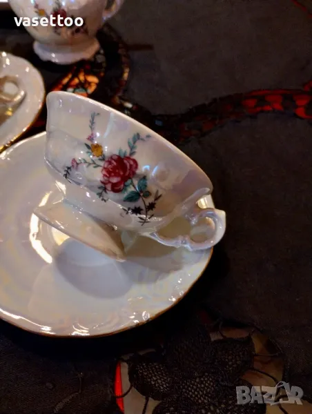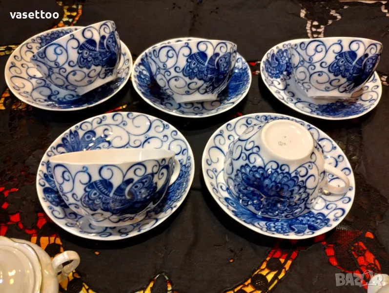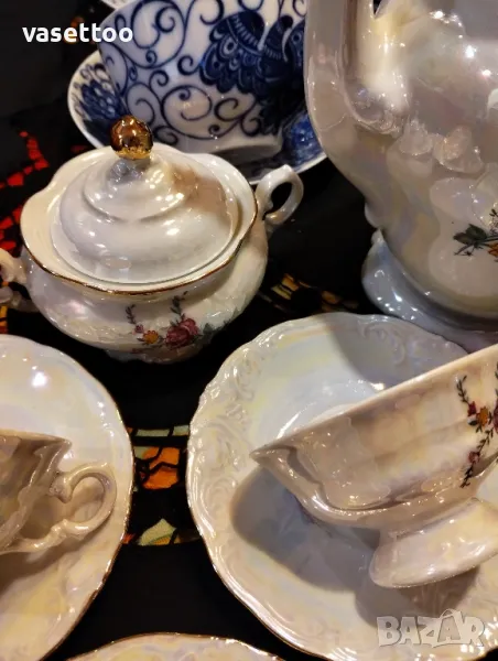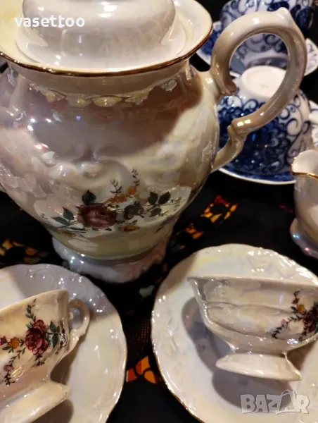 1.Неупотребяван полски сервиз за кафе от шест чашки 4.5/8см. и вместимост 100 мл., подложни чиниики 12 см., чайник, каничка и захарница-80 лв.2. Много красив комплект за чай с рядка декорация от пет чаени чаши 5.5/10 см.- 250 мл. и пет подложни чиниики 15 см.-100 ПРОДАДЕНИ!
