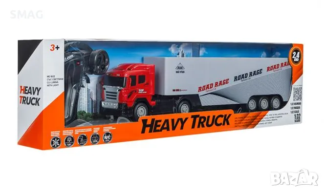 RC камион. Има напълно функционален, плъзгащ се контейнер, който се свързва с движение и цветни светлини. Има дистанционно управление и цветни светлини. Работи с 4 AA батерии за автомобила (не са включени) и 2 AA батерии за контролера (не са включени).