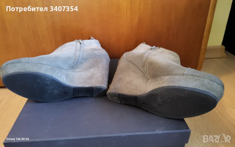 Удобни дамски боти от набук на висока платформа,с цвят средно между хаки и сиво , пролет-есен. Без забележки.Цветът е по-тъмен отколкото излезе на снимките .
