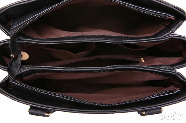 Материя: Еко кожаХастар: ТекстилДжобове:3бр. големи разделения1бр. малък джоб отзад с ципЗатваряне с ципМоделът се предлага с презрамка (дълга дръжка)Подарък: висящ ключодържателРазмери:Дължина - 23см.Ширина - 31см.Дъно - 14см.