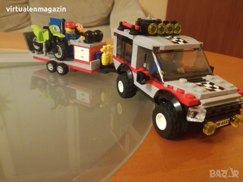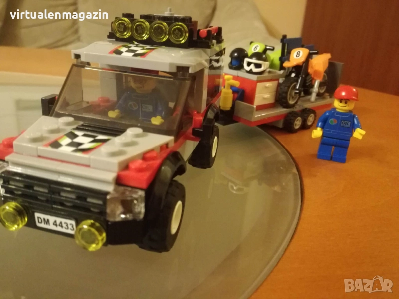 Включва: Джип за Офроуд, ремарке за мотори, 2 мотора, 2 фигурки, различни инструменти и аксесоари. Има дори и резервно колело за мотор!