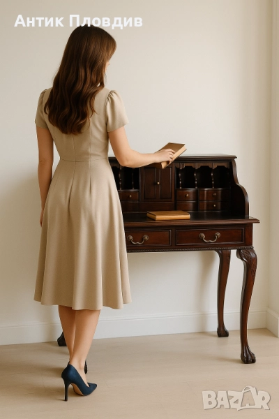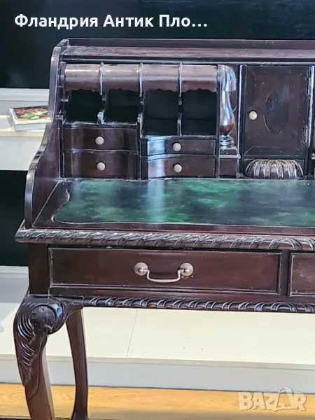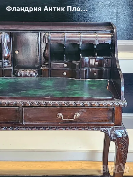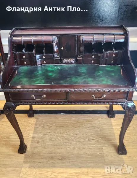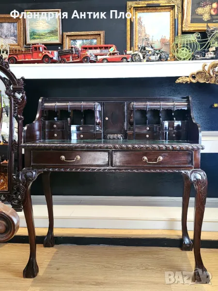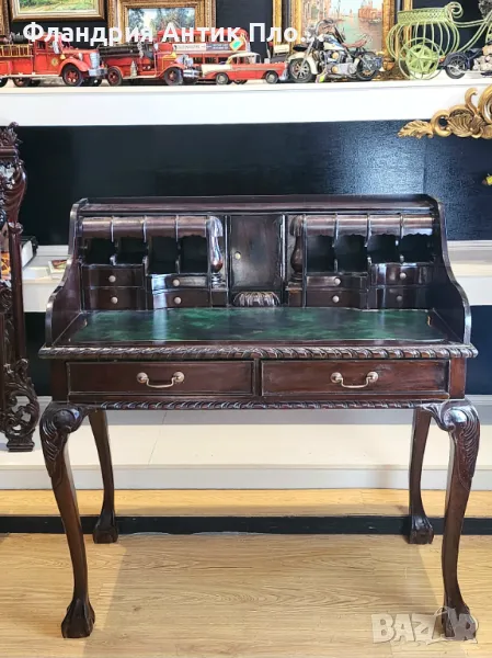 Това изискано писалище в стил Чипъндейл въплъщава елегантност и внимание към детайла. Плотът е облицован със зелена кожа, придаваща изтънченост и комфорт при работа. Дизайнът включва две големи чекмеджета за основните принадлежности, както и 11 малки чекмеджета. Съчетавайки класическия стил на Чипъндейл с функционалност, това писалище е перфектен избор за ценителите на изкуството и качествената изработка, подходящо за изискани кабинети или домашни офиси с исторически акцент.