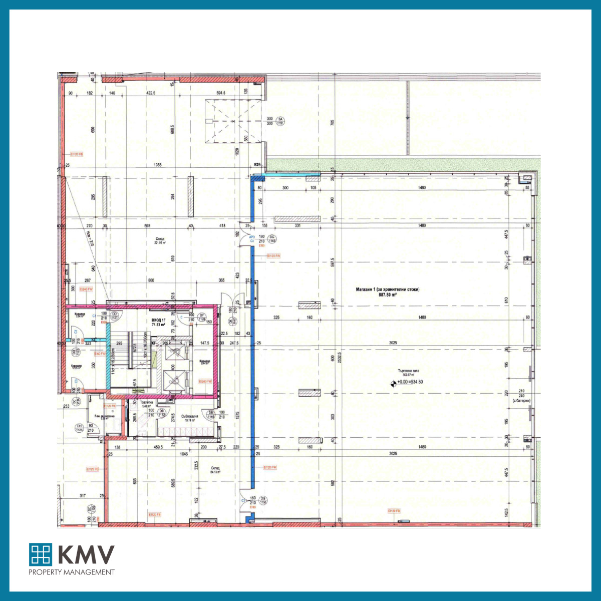 Магазинът се намира на партерен етаж, с чиста площ 887,80 кв.м и общи части 133,80 кв. м.