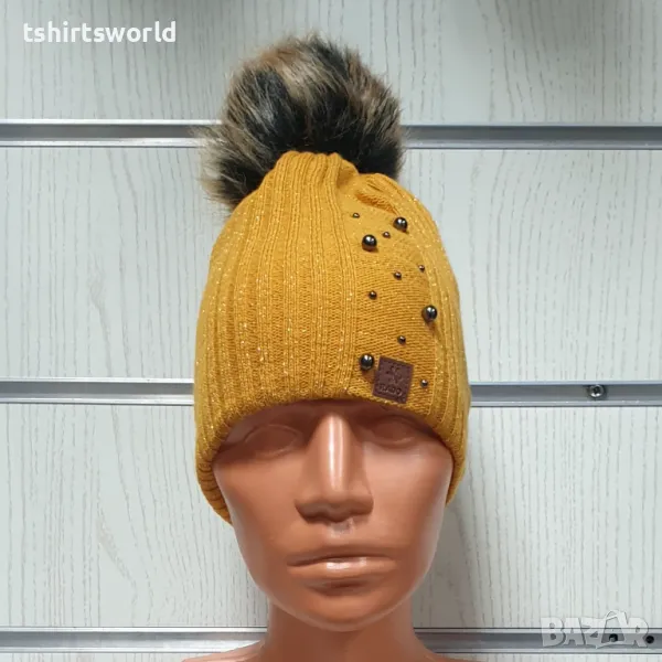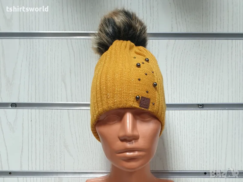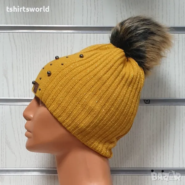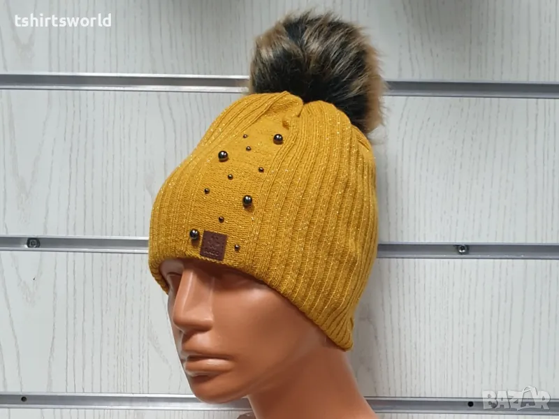 Нова зимна дамска шапка с камъчета в цвят горчица с пух/помпон → Обява 47928089
