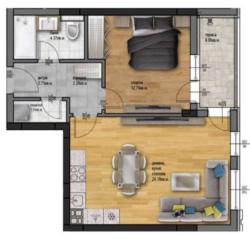 Жилището, което предлагаме за продажба е ДВУСТАЙНО и се състои се от просторна дневна с кухненски бокс и трапезария-24,18кв.м, спалня-12,74 кв.м, баня с тоалетна, входно антре, перално помещение и тераса. Изложение: изток. . Обща площ 73,34 кв.м.
