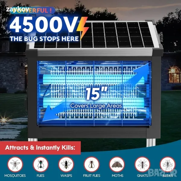 Модернизиран соларен ЗАППЕР 4 в 1: Устройството за унищожаване на насекоми комбинира 4 функции в 1: соларен уред за унищожаване на насекоми, вътрешен и външен уред за унищожаване на насекоми, преносима безжична мухоловка, уред за къмпингуване. Слънчево захранвани дизайнерски характеристики за използване на слънчева енергия за безпроблемна работа, без усилие привличат и елиминират широка гама от досадни летящи вредители, като комари, мухи, молци, пчели, оси и др. Нашият убиец на комари не използва никакви химикали и не излъчва дразнеща миризма, което е безвредно за хората и домашните любимци.