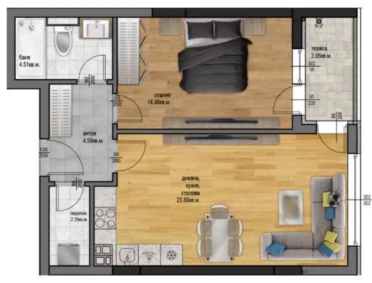 Жилището, което предлагаме за продажба е двустайно с изложение-изток. Състои се от дневна с кухненски бокс и трапезария-23,88 кв.м, спалня-14,48 кв.м, баня с тоалетна, входно антре, перално помещение и тераса. Обща площ 73,68 кв.м.