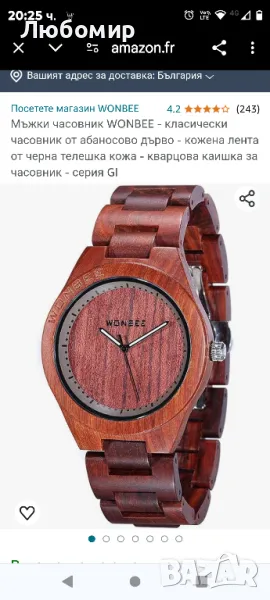 Мъжки часовник WONBEE - класически часовник от абаносово дърво .Часовникът ARTISANAL CONSTRUCTION включва 100% естествено, устойчиво червено сандалово дърво от Африка. Цялото дърво е ръчно шлайфано до гладко, издръжливо покритие.УДОБНИ, ЕСТЕСТВЕНИ И ИЗДРЪЖЛИВИ - защитени и запечатани с тунгово масло (устойчиво на пръски). За разлика от кожените ленти и нискокачествените метали, нашите внимателно подбрани твърди дървета няма да се развалят. Боите за дърво са органични и са естествено получени и не съдържат петна, багрила или агресивни химикали.
