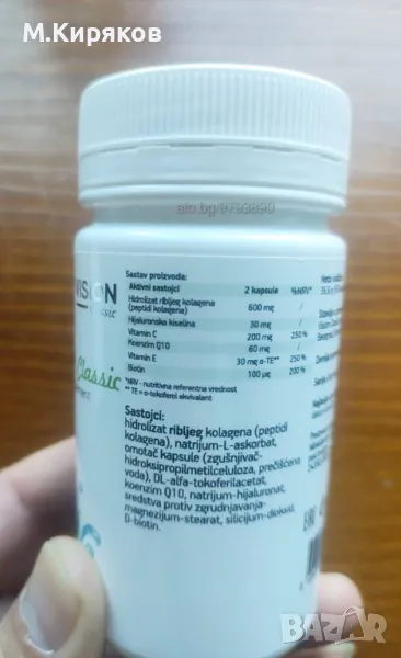 Състав: рибен колаген тип 1, натриев хиалуронат, витамин С, коензим Q10, витамин Е и биотин.