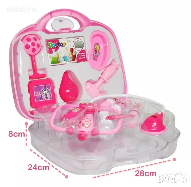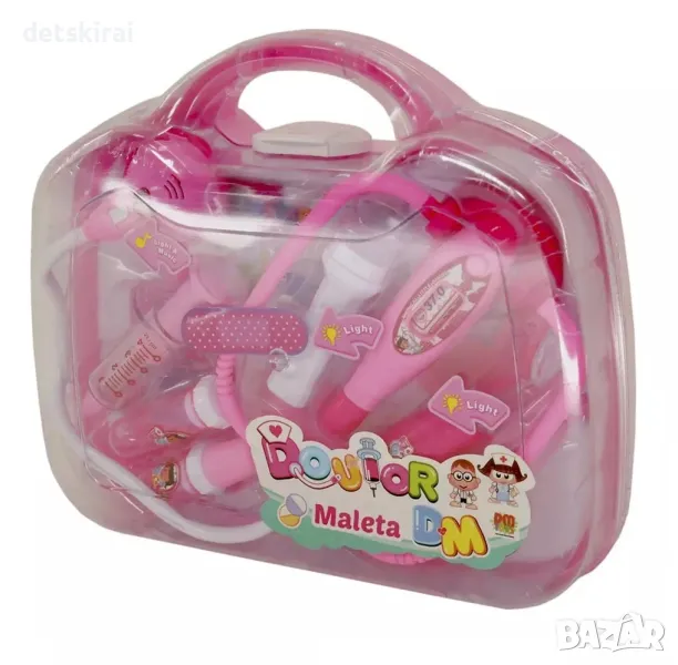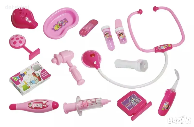 В комплекта има аксесоари, които позволяват на детето да изрази себе си и да освободи чувствата си. Когато стетоскопът се постави върху пациента или домашния любимец, той излъчва звук и светлина и манометърът включва фенерчето.