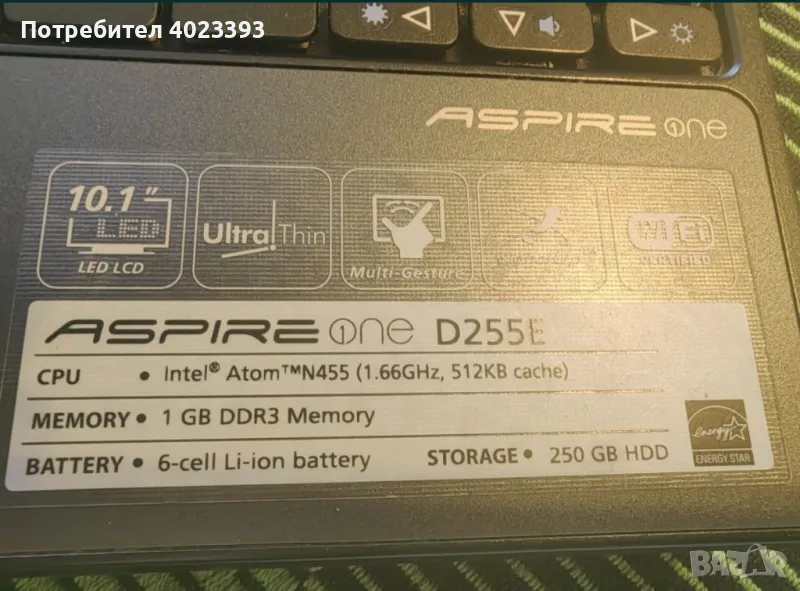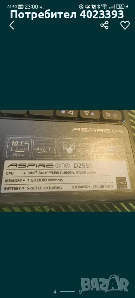 ноутбук лаптоп aspire one d255e, 10.1", двуядрен, 250гб хард диск, window 7 starter. Клавиетурата е с латинска и арабска азбука, понеже е купуван от Дубай. Минимално използван и много запазен. Със зарядно. Бонус - калъф.