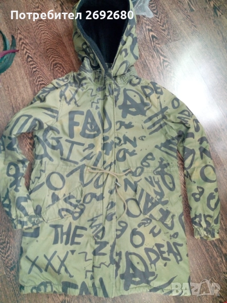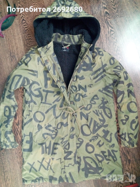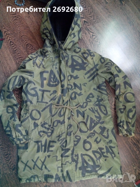 Якето изобщо не е носено, чисто ново е, размер L-ка. Има много дебела черна пухкава подплата отвътре, качулката също е много добре подплатена, може да се маха при желание.