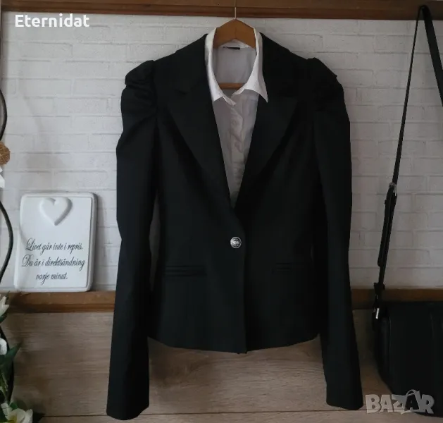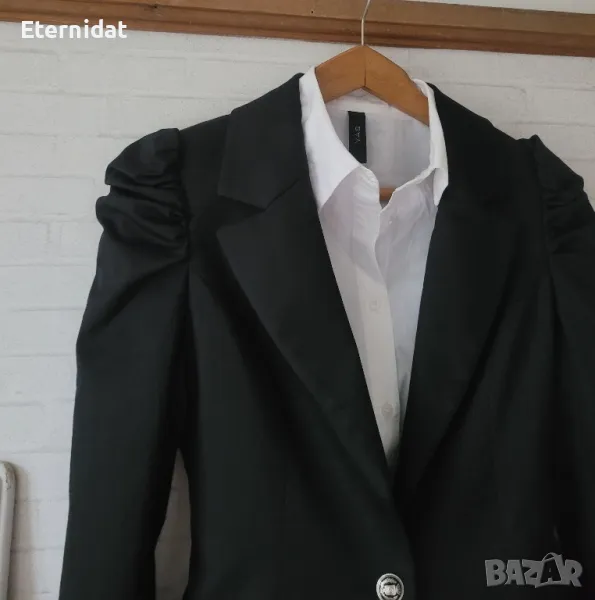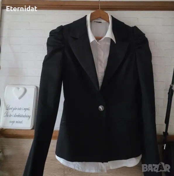 Сет от черно сако и бяла риза ( може и по отделно)1. Елегантен модел черно вталено сако с ефектно рамо MODALIN.Размер S.Цена 45лв2. Бяла риза H&M с ефектен ръкав . Памучна материя Размер SЦена 17лв.Цена за сета 60лв.