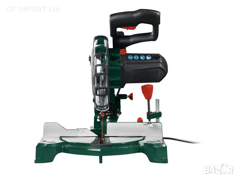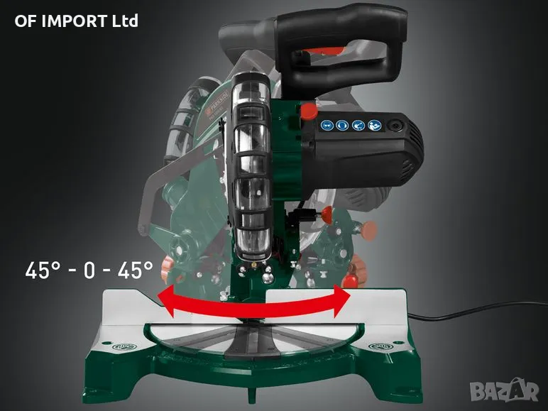 Режещия диск е с диаметър 210 милиметра с 48 зъба и регулиране на наклона 0 до 45 градуса.