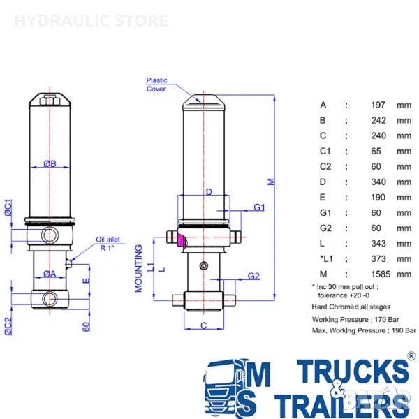 За монтирането на този Хидравличен цилиндър са необходими допълнителни елементи - горен комплект стойки (47000121) и долен комплект стойки (47000024), които се заплащат отделно. Цена при запитване.
