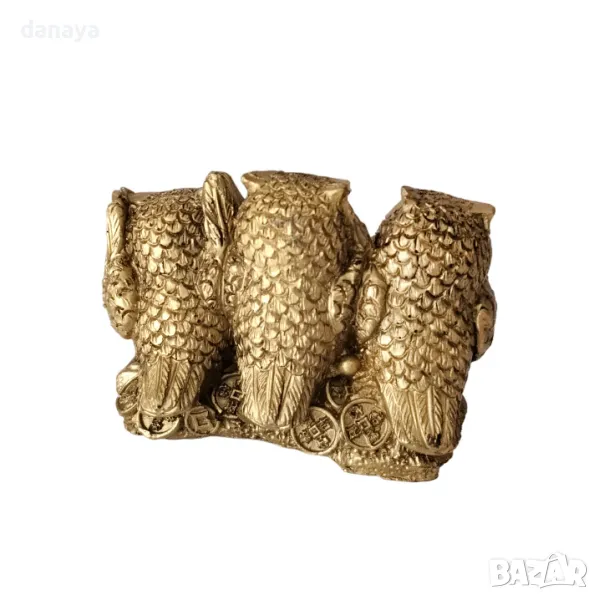 Малка фън шуй статуетка. Три малки сови, кацнали на клонче, които символизират трилогията „Не знам, не чух, не видях“. Статуетката е чудесен подарък за различни поводи, а също така и чудесно допълнение към вашия дом или офис. Според будисткото разбиране фигурите показват как трябва да реагираме на злото, за да се предпазим от него. Тоест не го виждаме, не го чуваме, не знаем за него. Така съхраняваме себе си и околните. Смисълът на фигурите е изключително дълбок, носи символика и може да се превърне в пазител на всеки дом. Фигурката е с малък компактен размер, предлага се в кутия.