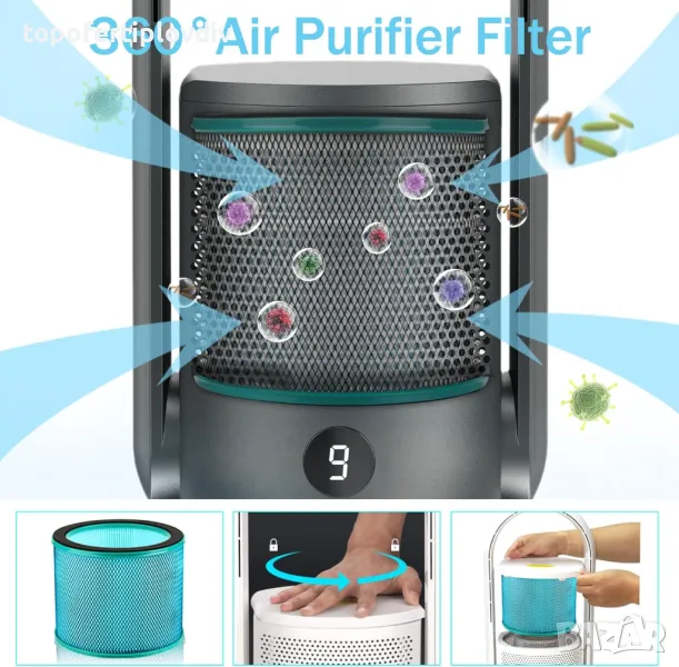 Вентилатор 2 в 1 с пречиствател на въздуха: тих вентилатор тип кула е оборудван с въздушен филтър H13 HEPA. Hepa филтър с 360° напълно затворена технология премахва 99,97% от всички алергени и ултра фини частици. Пречиства въздуха в помещението, идеален за страдащи от алергии и пушачи.
